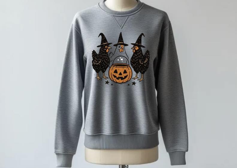 This Chicken-Pumpkin shirt features a fun Halloween design with adorable chickens wearing witch hats alongside festive pumpkins. Perfect for spooky season enthusiasts and poultry lovers alike!